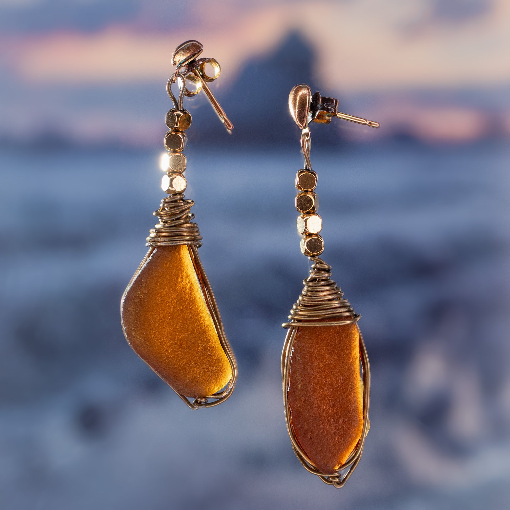 These warm amber-toned sea glass earrings are handcrafted using coastal treasures collected along the North East shoreline. Each piece is wrapped in gold-finish wire and accented with gold stainless steel beads, giving them a soft, sunset-like glow when worn. A beautiful way to carry the seaside with you.
