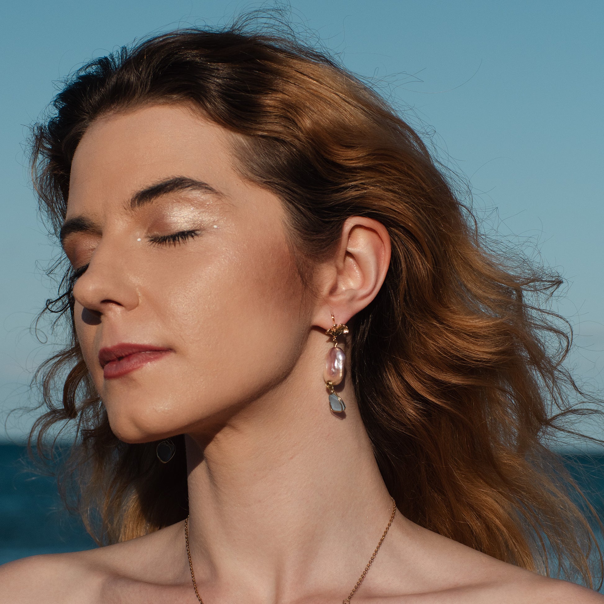 The Sirens Dawn Earrings capture the sea at first light. Each pair features luminous freshwater Keshi pearls and rare, handpicked sea glass, wrapped in brass wire with a gold finish. Topped with an elegant 18k golden stud, they’re a handcrafted design that carries the ocean’s untamed beauty into everyday wear.