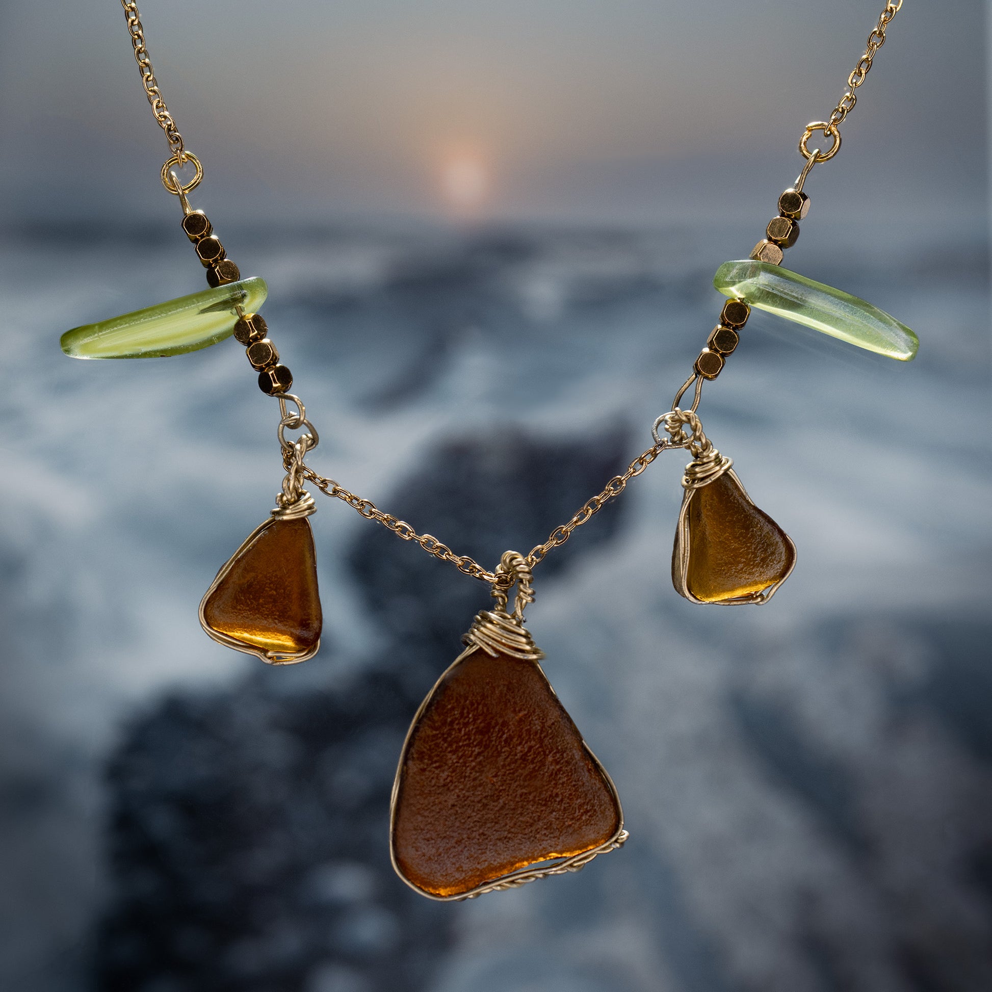 Materials: Amber sea glass collected along the North East coast, gold-finish brass wire & green glass beads, on hypoallergenic gold tinted chain.